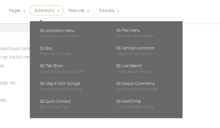 The S5 Flex Menu system is a very powerful plugin that provides functionality far beyond what the standard Joomla menu system can provide. This plugin is intended to be as an extension of the existing menu system in Joomla to add many new features! Please see the full list of features below.